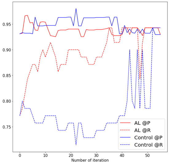 For evaluating performance, we use precision and recall. Precision is computed as the ratio of true positives to the sum of true and false positives, while recall is the ratio of true positives to the sum of true positives and false negatives. We compute each of these two metrics at every iteration, both to measure the the performance of the current AL, as well as the baseline classifier (‘control’) on the test set (the other 40% of the labeled data, which is not used by either classifier at any stage for learning). Because we followed this protocol, the results of the baseline and the AL classifier will coincide both at the beginning and at the end. In practice, both the size of the training set, as well as the relative scale of base training and pooling, can both be tuned during evaluation.