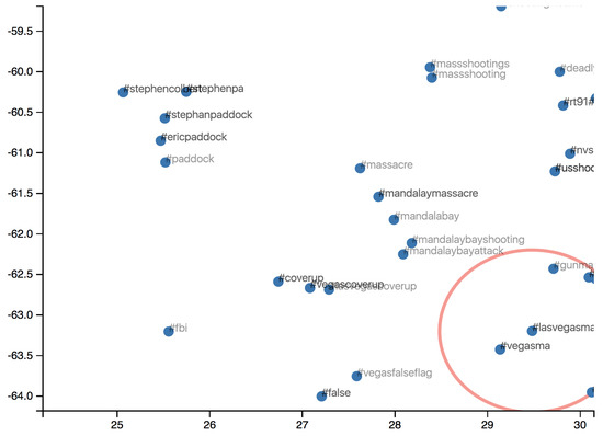 Returning to the case study, an example using ‘lasvegasmassacre’ as the query is shown in Figure 5. In the scatter plot, the hashtag is encircled in red, and one can intuitively note the similarities between that hashtag and other hashtags in the corpus. Similar hashtags, in the text embedding space (which uses the context to determine similarity) tend to be closer together, even when they share little in common in terms of the raw string. For example, when the user draws a bounding box around ‘lasvegasmassacre’ and zooms in, #lasvegasmassacre and #mandalaybayattack appear relatively close, even though they share no terms in common. This has been achieved without any manual supervision or labeling.