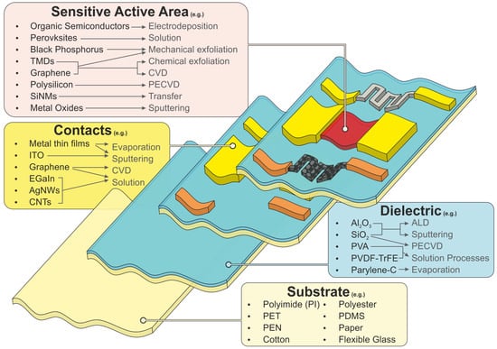 The previous sections presented the most widely used materials in the fabrication of flexible sensors. Most of the presented materials were observed to be deposited through conventional vacuum technologies such as thermal/e-beam evaporation [9], DC/RF sputtering [14,23], ALD [23], CVD [235], PECVD [27], and Organic Vapor Phase Deposition (OPVD) [336]. These thin films were then patterned using well established microfabrication techniques. These methods are overwhelmingly used for the deposition of high performance flexible semiconductor and dielectric materials, namely a-IGZO, LTPS, graphene and Al2O3. Nevertheless, these techniques require specialised equipment and are not easily scaled up to large area fabrication. Solution based processes such as spin coating [193], spray coating [337], electrospinning [147], roll-to-roll printing [338], inkjet printing [137,339,340], dispenser printing [341], and screen printing [337,342], offer an easier approach for the deposition of films on large area flexible substrates. In addition, these techniques are mostly applied at low temperatures, making them compatible with substrates that require a low thermal budget. Inkjet printing even excludes the need for patterning, as the desired features are directly printed on any surface with resolutions as high as 80 [339]. On the other hand, these processes are only easily compatible with materials that can be processed by solution methods, such as organic materials, perovskites or metal NP/NW solutions. Additionally, due to the low temperatures employed and the presence of solvents, the structures produced by these techniques tend to show worse performance when compared to similar structures processed by vacuum techniques. To solve this issue, photonic curing approaches that reduce the thermal stress on the substrates have also been proposed [17,343]. Regarding materials that cannot be directly grown or deposited on flexible substrates, such as SiNMs, polymer assisted transfer processes were also demonstrated [219].