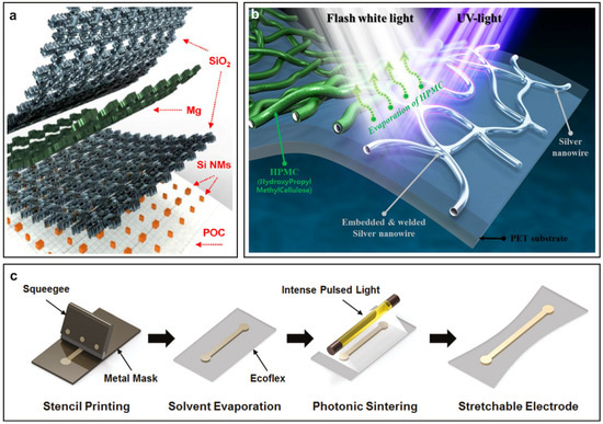 Metals combine conductivity and mechanical stability enabling their easy application in flexible devices. (a) Biodegradable sensor using Mg contacts. Reprinted with permission from [30]. Copyright 2015 American Chemical Society. (b) Improvement of the junction resistance of AgNWs [48]. (c) Highly stretchable contacts on Ecoflex™ by sintering of Ag nanoflakes. Reprinted from [57].