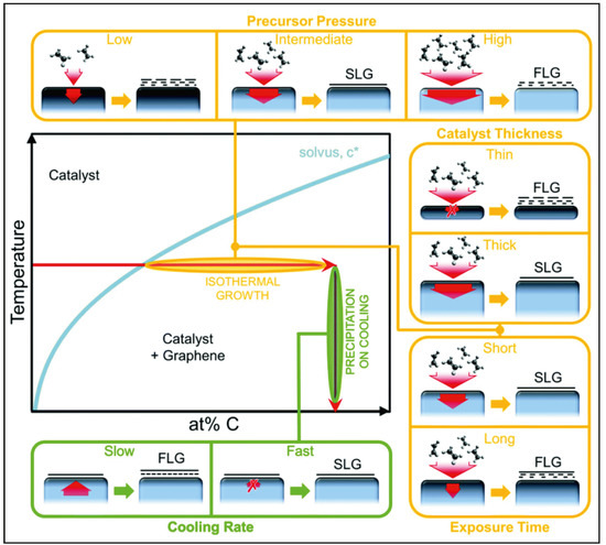 In 2004 the introduction of exfoliated few-layer graphene (FLG) by Novoselov et al. [82] led to a dramatic increase in the interest on carbon-based materials. The combination of its high carrier mobility (as high as 20,000 cmVS for electrons on a graphene field effect transistor (FET) [83]), with the ability to sustainably conduct high currents ( A/), made this material very attractive for the development of thin film transistors [84,85], battery electrodes [86], and sensors [87]. In the field of flexible electronics, carbon-based materials have found most of their applications as electrical conductors and can be found in various formats including CNTs [88,89], CNT fibres [90,91,92], graphene [93,94,95,96], reduced graphene oxide (rGO) [97,98,99], carbon black (CB) [100,101] and graphite [102,103,104,105]. Graphene is a 2D material that presents both the properties of a conductor and a semiconductor [106]. High quality graphene can be obtained by methods such as chemical vapour deposition (CVD) and both mechanical and chemical exfoliation [93]. Mechanical exfoliation, i.e., the scotch-tape method [82], is capable of producing high quality graphene but the dimensions and the manipulation of the individual layers are difficult to control. Chemical exfoliation is a widely used method for the development of flexible sensors. This method relies on the oxidation of graphite into graphene oxide (GO), followed by the reduction of this compound to form rGO. This step is usually incomplete leaving leftover functional groups across the graphene layers which reduce their conductivity, but also increase the sensitivity of rGO to various chemicals. This allows the fabrication of chemical sensors [107,108,109,110]. CVD graphene is also very interesting for the development of flexible sensors due to its large area fabrication potential. Figure 3 shows the growth relation between the temperature and the quantity of carbon precursor present at the surface of the metal catalyst [111]. As can be seen, by controlling these parameters, both thin and thick films of FLG and single-layer graphene (SLG) can be obtained. Typical metals used as a catalyst for CVD graphene are Ni and Cu. In addition, the grown graphene can be transferred to any substrate by the deposition of poly(methyl methacrylate) (PMMA), followed by the etching of the metal layer. The floating graphene/PMMA surface is then deposited on the desired substrate.