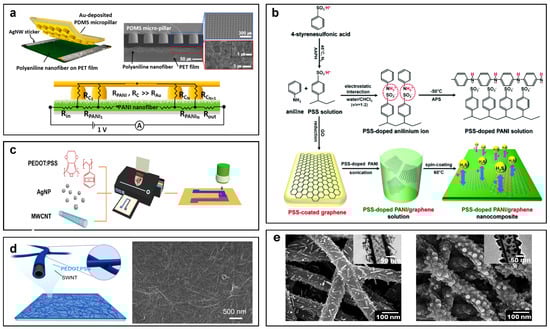 Examples of fabrication and structures of organic conductors. (a) PDMS micropillars and PANI nanofibres pressure sensor, schematic representation (left) and cross-sectional SEM image (right). Adapted with permission from [136]. Copyright 2015 American Chemical Society. (b) schematic representation of synthetic process of PSS doped PANI/graphene nanocomposites. Adapted from [125]. (c) Schematic illustration of the printing process of PEDOT:PSS, silver nanoparticles (AgNPs) and MWCNT inks on paper. Adapted with permission from [145]. Copyright 2017 American Chemical Society. (d) SWCNTs and PEDOT on PDMS, schematic illustration (left) and SEM image (right). Adapted with permission from [154]. Copyright 2017 American Chemical Society. (e) SEM image of hydroxilated PEDOT nanotubes with nanorods (left) and nanonodules (right) as surface structures. Adapted with permission from [148]. Copyright 2017 American Chemical Society.