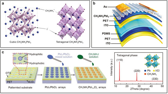 Perovskite thin films are deposited by solution methods and find most of their applications in flexible light sensors. (a) Crystal structure of perovskite. Reprinted from [288]. (b) CH3NH3PbI3 flexible photodetector. Reprinted from [278]. (c) Solution process for the fabrication of CH3NH3PbI3−xClx arrays. Reprinted from [279].