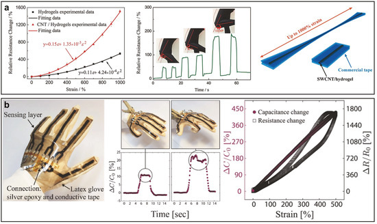 Shintake et al. [101] created capacitive strain sensors (gauge factor 0.83–0.98) with a hysteresis of 4.2% at 500% strain cycles. In comparison, a resistive strain sensor (gauge factor 1.62–3.37) presented in the same work showed a hysteresis of 35.9% at 500% strain cycles. The sensors were fabricated using carbon black filled elastomers and are shown in Figure 8b. CNTs were used to construct a durable (10,000 cycles at 100% strain) capacitive strain sensor with a response time of and a maximum strain of 300% [322]. The device was fabricated by adhering CNTs films onto PDMS and Dragon Skin™ substrates.