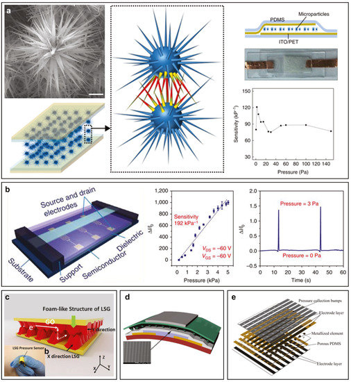 Various examples of performing pressure sensors. (a) ZnO-microparticle scanning electron microscopy (SEM) image, morphology and pressure sensor concept with the corresponding sensitivities per applied pressures. Scale bar, 1 . Adapted from [422]. (b) Gate suspended, pressure sensitive thin film transistor [10]. (c) Laser-scribed graphene (LSG) pressure sensor with foam-like structure [418]. (d) Multi-functional P(VDF-TrFE) field effect organic transistor using a microstructured dielectric layer. Adapted from [11]. (e) AgNWs/PDMS pressure sensor array using a stacked structure [432].