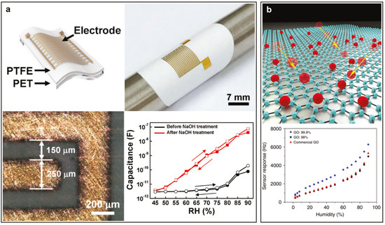 Dielectric materials are typically employed in flexible sensors as part of field-effect transistors used to detect or process the desired signals, as well as part of capacitive sensors. Dielectrics compatible with flexible substrates are either inorganic, such as Al2O3 [23,33,34,217,237], SiO2 [14,15,28,30,31,34,217,218,222], HfO2 [289,290], TiO2 [13], or organic materials e.g., polyvinylphenol (PVP) [29,239], polyvinylpyrrolidone [170], poly(perfluorobutenylvinylether) CYTOP [10,291], PDMS [25], polylactide (PLA) [292,293], poly(vinylidene fluoride) PVDF [294,295,296], PVDF-Trifluoroethylene (PVDF-TrFE) [11,297,298,299,300,301,302], or GO [303]. Al2O3 is widely used in flexible sensors due to the possibility to deposit this material using atomic layer deposition (ALD) at room temperature (33 ) and obtain dense ( /) films with a dielectric constant of 7.5, a breakdown voltage of / and leakage currents below / (5 bias) [304]. Films of Al2O3 presenting a higher dielectric constant of 9.7 were obtained using spin-coating followed by an annealing step, but the high temperatures used (350 ) limit the implementation of this method on flexible substrates [305]. In comparison, sol-gel, spin-coated TiO2 films exhibited a dielectric constant of 27 and a leakage current of roughly / (2 bias) when annealed at 250 [13]. SiO2 has been extensively used in flexible sensors [14,15,28,30,31,34,217,218,222] due to its well established properties and fabrication methods, but it presents a dielectric constant of 3.9 which is lower than other inorganic dielectrics [306]. Regarding organic dielectrics, this class of materials typically presents lower dielectric constants e.g., PVP (3.6) [307], CYTOP (2.1–2.2) [308], and PVDF-TrFE (10.4) [309]. Nevertheless, PVDF-TrFE still presents a higher dielectric constant when processed at 140 by spin-coating than Al2O3 [309]. Organic dielectric materials also tend to present better mechanical properties, and materials such as PDMS can be easily implemented as stretchable dielectrics [310]. Finally, although PVDF has been described as a dielectric, this material possesses piezoelectric properties, making it very useful for strain and pressure sensors [11,294,296]. Interestingly, on its own, PVDF will not grow in the piezoelectric favourable β-phase unless precise mechanical stretching or electrical poling is applied [297]. Its crystallisation in this phase is achieved using crystallisation centres such as ZnO [296], or AgNPs/graphene [295], or by adding a co-polymer. PVDF-TrFE tends to crystallise directly on the β-phase, explaining its widespread adoption over standalone PVDF [298].