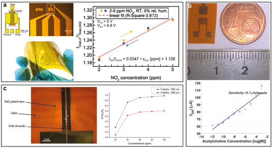 The wide adoption of n-type a-IGZO for flexible circuits and sensors arises from its mechanical stability when bent down to micrometre range radius [180], and low temperature processing options such as DC sputtering [14,181], RF sputtering [15,23,33,36], and solution methods [182,183], resulting in large area and polymer processing compatibility. In addition, electron mobilities in excess of 70 2−1−1 [184], and Ion/Ioff above 1010 have been reported [185]. Yao et al. [186] recently presented a method to deposit a-IGZO on polyimide (PI) substrates through pulse DC magnetron sputtering. Excluding a 1 150 photoresist bake, the whole process was conducted at 22 . Flexible a-IGZO TFTs fabricated using this technique showed saturation mobility up to 2−1−1, Ion/Ioff above 107 and subthreshold swing of 320 / [186]. In addition to a-IGZO, flexible ZnO has also been widely used in flexible sensors, where it finds most of its applications as the sensitive layer of UV sensors due to its bandgap ( ) [187], large exciton binding energy (60 ) [187], and high mobility above 50 2−1−1 [188]. Boruah et al. [187] showed that the light-harvesting efficiency (LHE) of ZnO improved for self-assembled microstructures when compared to conventional thin films. More specifically, the LHE for ZnO films increased from 30% to 84% for ZnO nanorods, and furthermore to 98% for vanadium (V) doped ZnO nanoflakes. Due to the advantages offered by the properties exhibited by metal oxide semiconductors, they have been widely employed in flexible sensors.
