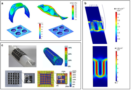- Overvelde, J.T.; Mengüç, Y.; Polygerinos, P.; Wang, Y.; Wang, Z.; Walsh, C.J.; Wood, R.J.; Bertoldi, K. Mechanical and electrical numerical analysis of soft liquid-embedded deformation sensors analysis. Extrem. Mech. Lett. 2014, 1, 42–46. [Google Scholar] [CrossRef]