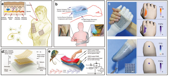 - Hammock, M.L.; Chortos, A.; Tee, B.C.K.; Tok, J.B.H.; Bao, Z. 25th Anniversary Article: The Evolution of Electronic Skin (E-Skin): A Brief History, Design Considerations, and Recent Progress. Adv. Mater. 2013, 25, 5997–6038. [Google Scholar] [CrossRef]