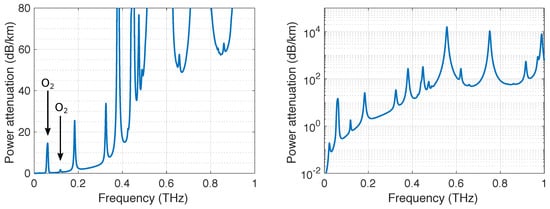 Terahertz wave atmospheric power attenuation for temperature 20 °C and water vapor density g/m at sea level. Left and right plots shows linear and logarithmic scale, respectively. Left plot indicates two predominant molecular oxygen (O) absorption lines at 60 GHz and 120 GHz.