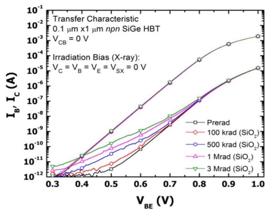 Transfer characteristics of a SiGe HBT following various total radiation doses. Upper family of curves shows collector currents and lower family shows base currents . Used with permission from [].