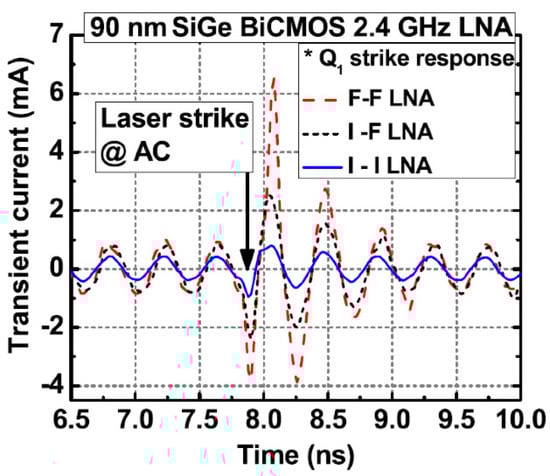 Dynamic interference in different low-noise amplifiers generated by pulse-laser induced SEE experiment. For the core cascode stages, either forward (F) or inverse (I) mode SiGe HBTs are used. Used with permission from [].