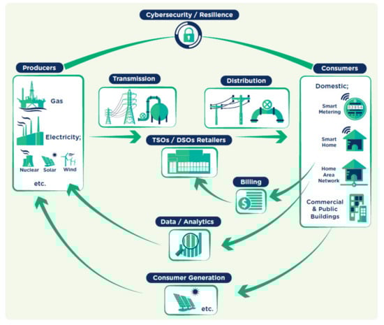 The process of “smartization” of devices (smart energy equipment, smart energy storage), networks (smart grids), and monitoring systems (smart energy meter) is leading to the so-called “Internet of Energy” (IoE) [7,8]. The modern “energy supply chain”, as represented in Figure 1, is based on a bidirectional flow of power from producers to consumers and vice-versa, fully integrated in a continuous stream of data allowing a full control and monitoring of the system.