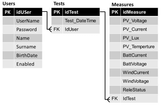 In particular, with this configuration, users are identified by means of a unique username and password, which is encrypted in MD5 format. In addition, a Boolean field allows the system enable/disable users in order avoid simultaneous uses of the demonstrator. Each user can perform various kind of tests on the demonstrator, which are identified by date/time and are linked to the user running the test, to be reanalyzed in a second time for didactical purpose. For each test, the corresponding set of measures can be easily identified by means of the one-to-many relationship between the table’s tests and measures. In particular, the demonstrator has been equipped with voltage, current, temperature, and luminosity sensors in order to give the users a complete set of measurements on the behavior of the microgrid. The data acquisition and real time control of the demonstrator is obtained by means of an Arduino Due board, which is equipped with an Ethernet Shield and is configured to acquire the data coming from the sensors and to store them into the MySql Database.