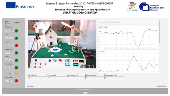 This interface is composed of a control module and a monitoring module. The control module gives the possibility to switch on/off the relays of the demonstrator (e.g., lights, fans, etc.), in order to simulate different energy scenarios. The monitoring module is divided into a webcam section, to show to the user real-time videos of the demonstrator, a measurement panel, which gives real-time information about the measurement of the main parameters and a chart panel. That chart panel is realized by using the open source Thinger.io platform and gives the possibility of analyzing the behaviors of main electrical and thermal parameters as a function of time. An additional feature of this software interface is represented by the possibility for the users of locally downloading all the measures related to their tests. This feature can be realized thanks to the interaction between php page and MySql Database.