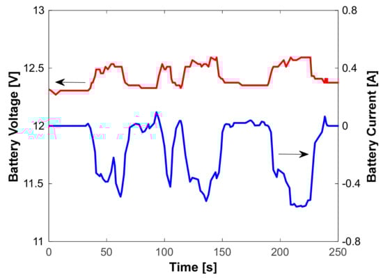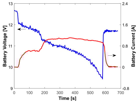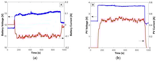 As is clear from the above results, in this case, the electric power is supplied with the only contribution coming from the battery pack. As a consequence, the first decrease in the battery voltage, of ~1 V, is related to the activation of the first load, represented by the water pump. Then, the battery pack begins its discharging phase with a current value of 0.7 A. The corresponding battery voltage decrease, after 3 minutes, is ~1 V. At this point, the switch related to the fan is activated and the battery discharging current increases its value up to 1.2 A, until the battery discharging voltage of 9.6 V is reached.
