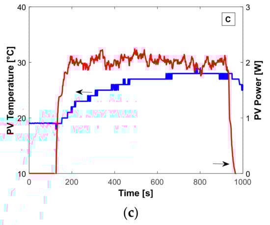 It should be also noticed that the activation of the external lamp involves an increase in the temperature of the PV panels, which can be evaluated through the related sensors installed on the demonstrator. In particular, for this test, a temperature increase of ~10 °C has been observed (Figure 7c).