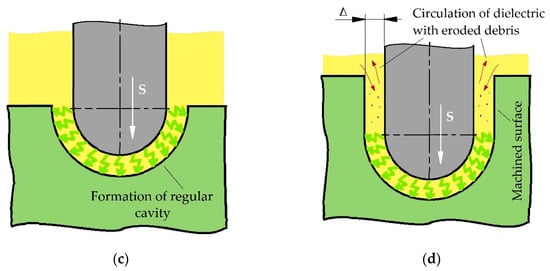 Diagram of the electrical discharge machining (EDM) process by example of cavity formation on the surface of conductive nanoceramics: (a) Dielectric breakdown; (b) stabilization of discharge pulses; (c) formation of regular cavity; (d) ongoing processing; S is electrode feed speed; Δ is a discharge gap.