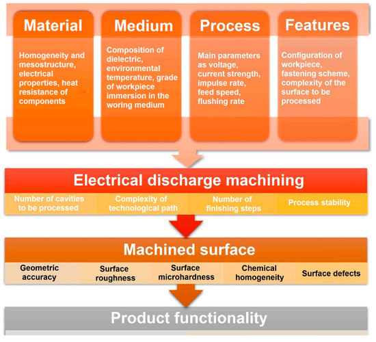 All these factors influence the stability of EDM. The quality of the processed surface can be controlled by measuring final geometrical accuracy, roughness, microhardness, change of chemical content in subsurface layer (up to the depth of ~4–10 µm), homogeneity of the processed surface, and an absence of the visible defects, which can influence the final product appearance and functionality. In this case, the product functionality can be presented as a complex, which consists of its operational ability as part of a more sophisticated unit such as a mechanism or machine and its appearance following customer requirements.