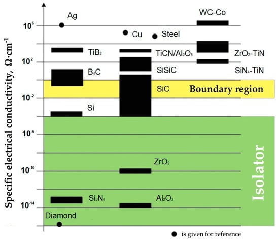 EDM is possible only if the minimum electrical conductivity of materials is about 10-2 Ω·cm-1. The electrical conductivity of the material is a critical factor in the success of the process of electrical erosion. All metals fulfill the condition in terms of minimum electrical conductivity, which is not the case with ceramics and its composites. Figure 4 shows the main ceramic materials, depending on their conductivity. Electrically conductive ceramics such as SiC, TiB2, TiN, and TiC are treated with EDM, while the electrical conductivity of Al2O3, ZrO2, Si3N4 is not enough to initiate processing. As it was mentioned before, at present, two different ways of processing non-conductive ceramics by EDM are used: