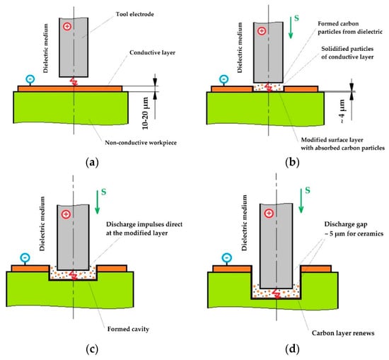 Figure 5. Schematic diagram of the EDM of non-conductive materials using a specially developed electrically conductive coating: (a) Initiating discharge impulses between the coating and the tool electrode; (b) electrical erosion of the coating, formation of the erosion products between the conductive film and the electrode tool; (c) electrical erosion of the non-conductive workpiece with absorbed erosion products by the workpiece; (d) reinitiating electrical erosion of the workpiece that keeps constant presences of the erosion product in sub layer of the workpiece.
