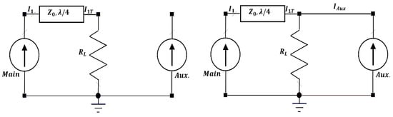 The medium input power region, where the auxiliary amplifier turns on and starts acting as an additional current source by contributing more current into the load and where the overall output power will be increased, is shown in Figure 2b. The apparent load impedance seen by the inverter, at the summing node, will be increased as the auxiliary amplifier current increases. Hence, the carrier amplifier will see less impedance, but it remains almost saturated. In this case, the total output power will be increased as the total current is increasing, as illustrated by these equations: