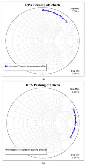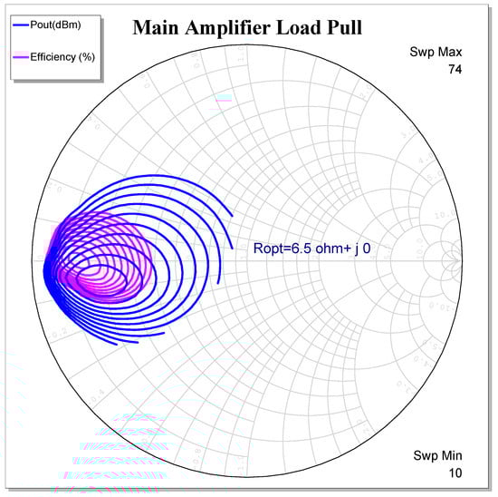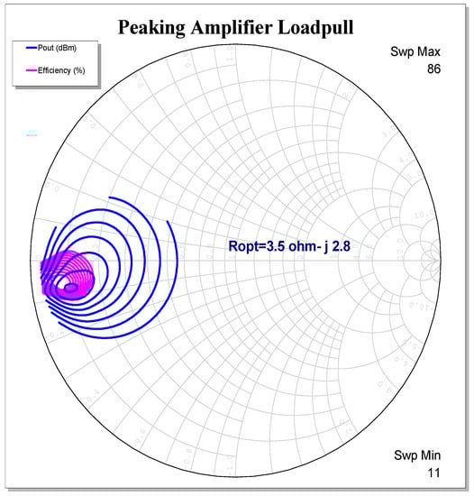 AWR MWO software (AWR Corporation, El Segundo, CA, USA) was used to perform the simulation, where the substrate material used in the design was Rogers RO4350B (Global Headquarters, Chandler, AZ, USA). After stabilizing both amplifiers, the load-pull analysis was performed in order to determine the optimum load impedance that the transistor needs to see, as shown in Figure 4 and Figure 5. It can be seen that the main amplifier needs to see a pure resistance of 6.5 Ω to give about 80%, whereas the peaking amplifier needs to see a complex load impedance of 3.5–2.8 Ω.
