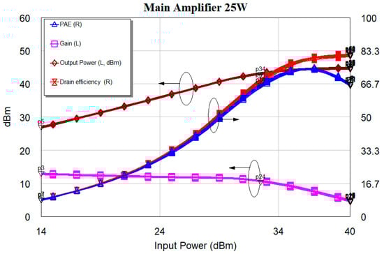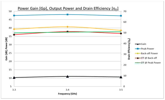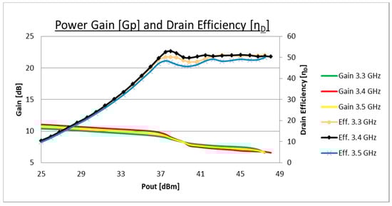 After that, both amplifiers’ circuits were designed and fabricated as shown in Figure 6. The amplifiers are designed to work in 3.3–3.5 GHz, where the performance of each designed amplifier, in terms of gain, output power, power added efficiency (PAE) and drain efficiency, and are shown in Figure 7 for the carrier amplifier and Figure 8 for the auxiliary amplifier. It is cleared at the back-off, and afterward, the auxiliary amplifier starts injecting the current due to biasing condition.