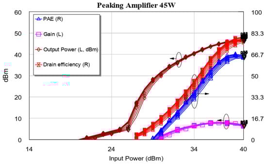 The measured performance of the designed Doherty power amplifier is shown in Figure 12 and Figure 13, where the designed amplifier achieved about 8 dB output back-off with an average efficiency of 50% at that region. Hence, it can be noticed that the total output power is increased by the current injected by the auxiliary amplifier. At the same time, the total gain of the Doherty amplifier is lower than the single ended amplifier due to the effect of the input splitter, and the fact that the peaking amplifier is OFF.