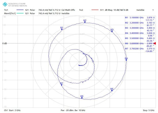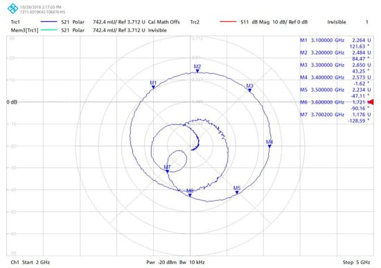 In terms of the small signal measurements, the gain phase measurement was used as a tool for illustrating and tuning the phase difference between the output of the two amplifiers. In the Doherty amplifier, there are two cases: The first is when only the main amplifier is working, and the other is when both amplifiers are working. The output signals of the amplifiers should be in-phase, so that both amplifiers’ currents can be combined to perform the load-modulation at the summing point. Figure 10 and Figure 11 show the Doherty amplifier gain phase (S21) when only the carrier amplifier is working and when both amplifiers are ON. Respectively, it can be noticed that there is a minimal variation in the phase when both amplifiers are ON. This means that the output signals of both amplifiers are in phase. These measurements have been achieved by changing the biasing condition of the peaking amplifier so that the status of the peaking amplifier can be changed from OFF to ON.