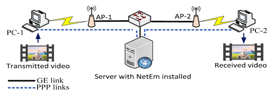 It incorporated two wireless Cisco© Access Points (APs) AIR-AP1852 (Cisco, place of origin: China) that have four external dual-band antennae. Cisco© Catalyst 3560 (Cisco, place of origin: China) switch connected via 1 Gigabit Ethernet (GE) the APs and the network emulator (NetEm), installed on a laptop computer acting as a server. The arrangement established point-to-point protocol (PPP) link between the PC-1 and PC-2. NetEm was situated in between the PPP connections to allow the traffic parameters, i.e., delay, jitter and %PLR to be controlled and thus drive the network toward different transmission quality. The control provided a mean of creating transmission environments for good, medium and poor video qualities. The video was sent over a PPP link such that the traffic from PC-1 transmitted to PC-2 through NetEm server [32]. The selected video was a Big Buck Bunny [33] clip, duration 90 seconds and consisting of 1350 frames. The video format was MPEG-2, all encoded using H.264. The frame pixel resolution was 1280 pixels × 720 pixels.