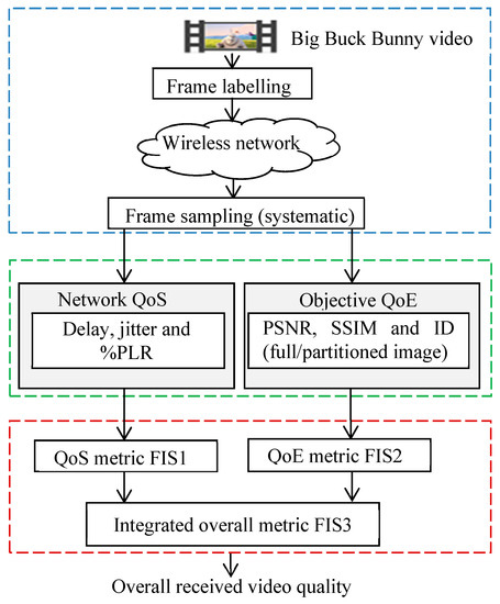 An ability to quantify the quality of a video transmitted over wireless computer networks is important in evaluating the networks’ operation and performance. Two interrelated parameter groupings characterize wirelessly transmitted video quality. A grouping is related to the traffic and can be characterized by packet transmission delay, jitter and loss. These traffic measures can be accommodated as part of a quality of service (QoS) assessment [1,2]. The second grouping indicates the effects of noise and associated distortion on the images making up a video. These directly influence the user’s perception of the video and can be accommodated as part of the quality of experience (QoE) assessment [3,4]. The overall quality of the received video can be quantified by combining the QoS and QoE measures [5,6,7].