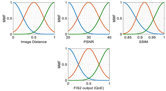 The inputs to the FIS2, i.e., the PSNR, SSIM and ID were fuzzified using three Gaussian membership functions referred to as low, medium and high. There are shown in blue, red and green in Figure 5. The output was defuzzified by three membership functions that represented low, medium and high QoE. These membership functions are shown in Figure 5. The ID results were normalized between 0 and 1 by identifying the highest and lowest values.