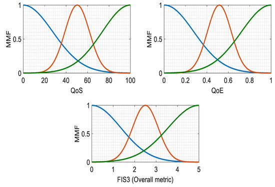 FIS3 combined the QoS and QoE values determined from FIS1 and FIS2 to indicate the overall quality of the received video. The output was in the range of 0 (lowest quality) to 5 (highest quality). The QoS and QoE values were fuzzified using three Gaussian membership functions referred to as low, medium and high. These are shown in blue, red and green plots in Figure 6.