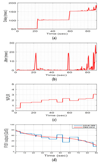 (a) Traffic delay, (b) jitter (c) percentage packet loss ratio (%PLR) and (d) quality of service (QoS) obtained from FIS1.