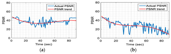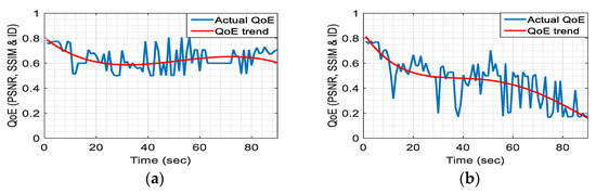 Figure 14a,b shows plots for QoE determined by FIS2 for the full and partitioned images respectively. The partitioned image method represented the video quality more precisely as Figure 14b relates to the QoS plots in Figure 10 more closely.