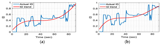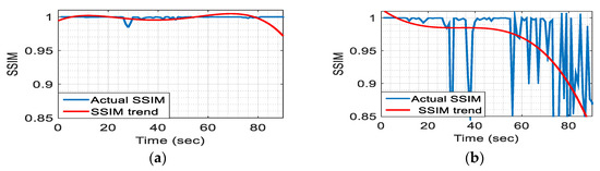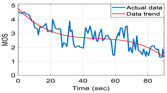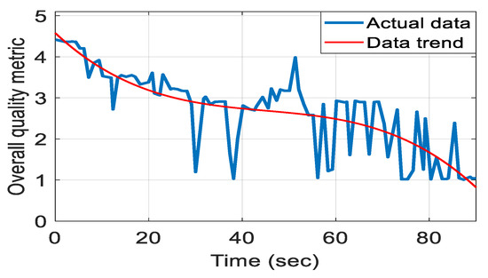 The red graph through the plot shows its trend obtained by a 4th order polynomial. A relationship can be observed when comparing the trends in Figure 18 and those in Figure 14b (i.e., FIS2 output that was generated from PSNR, SSIM and ID) and the overall video quality obtained by FIS3 (that integrated PSNR, SSIM and ID with delay, jitter and %PLR) shown in Figure 16. In Figure 14b and Figure 16, larger values represent higher quality but in Figure 18 lowest values represent higher quality, thus, the trends are inverted. In Figure 14b and Figure 16, the images corresponding to times at 30 and 59 seconds had very low quality as indicated by a drop in the plot. The corresponding images in Figure 18 had also low quality as indicated by a large increase in the plot. The images corresponding to the time between 85 and 90 seconds had the lowest quality in Figure 16. These images provided the lowest QoS as indicated in Figure 10d. However, the corresponding images when assessed using SPSss did not have the lowest quality. This signifies an advantage of the FIS method reported in this paper that integrates QoE and QoS to provide an overall measure.