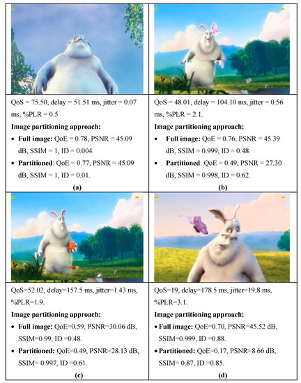 Typical images illustrating the values for QoS, quality of experience (QoE) and the effect of image partitioning on determining quality of received images: (a) Time 5 seconds, (b) time 43 seconds, (c) time 65 seconds and (d) 90 seconds.
