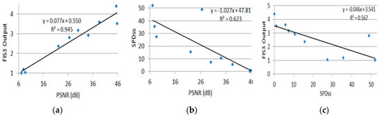Plots for (a) FIS3 output against PSNR, (b) SPDss against PSNR and (c) FIS3 output against SPDss.