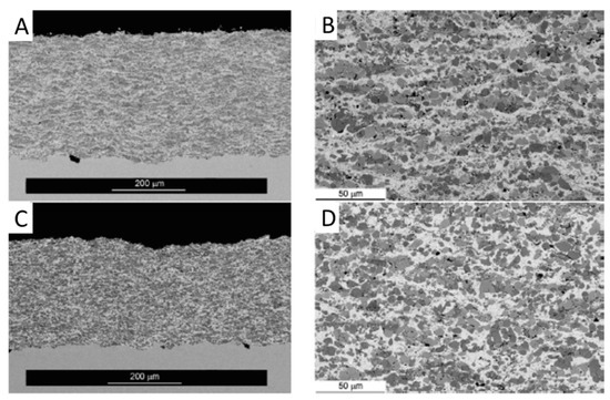 (A,C) Low and (B,D) high-magnification micrographs of dense HVAF-sprayed Cr3C2–NiCr coatings, illustrating the ability to refine microstructures by varying nozzle configuration. (A,B): M3; (C,D): M2 [23].