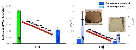 Studies showing superior (a) wear and (b) corrosion behavior of HVAF WC-CoCr coatings compared to the corresponding high-velocity oxy-fuel (HVOF) coatings. While (a) depicts the coefficient of wear (in mm3/Nm) under abrasive wear conditions, (b) compares the corrosion current density, Icorr (A/cm2), and the corrosion potential (Ecorr/V) for HVOF and HVAF coatings deposited using identical feedstock.