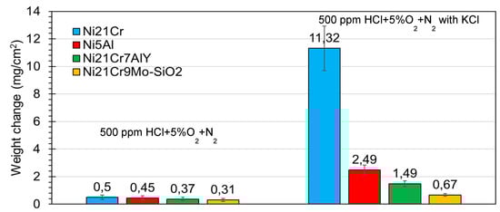 Weight change of the HVAF-sprayed Ni21Cr, Ni5Al, Ni21Cr7AlY, and Ni21Cr9Mo-SiO2 coatings in HCl-laden environment at 600 °C after 168 h exposed with and without KCl.