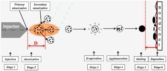 Schematic of various stages leading to coating formation by suspension plasma spraying (SPS) [49].