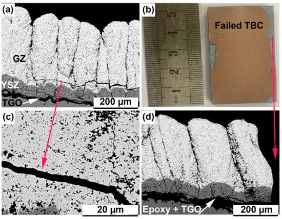 A triple layered GZ-based TBC (GZ dense/GZ/YSZ) failed during thermal cyclic fatigue test. (a) SEM micrograph showing failure in TGO; (b) photograph of failed specimen; (c) SEM micrograph showing horizontal crack in GZ; (d) SEM micrograph from different region showing failure in TGO [57]. (GZ = gadolinium zirconate; YSZ = yttria stabilized zirconia; TGO = thermally grown oxide).