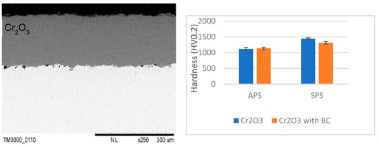 A desire to further build on the SPS expertise has now led to dedicated efforts aimed at utilizing the SPS route to deposit various other oxides and carbides that can be potentially promising candidates for tribological applications. In this context, some early work has already been carried out with Al2O3, Cr2O3, Cr3C2, and TiC suspensions, as well as graphene [71,72,73]. These have yielded microstructures and properties that inspire confidence (Figure 9) to be further investigated in detail.
