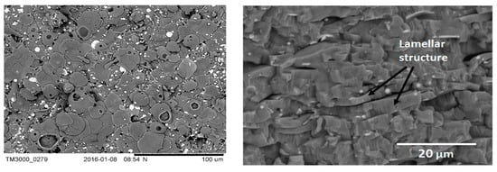 (left) Surface morphology of a typical alumina (powder)–YSZ (suspension composite coating showing multiscale structure [22] and (right) transverse fractured surface of the composite coating showing vertically aligned solidification feature in alumina splats with distributed YSZ (seen as the brighter phase in both micrographs) [21].