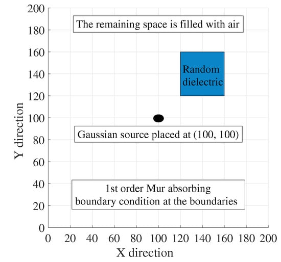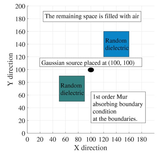 where , , and denote the dielectric permittivity, the magnetic permeability, and the conductivity of the background medium, respectively. Additionally, and are the spatial steps in the x and y directions, and is the time-step value. A medium with stochastic electric and magnetic properties is modeled by introducing uncertainty in the parameters , , and . Also, the randomness in the width and height of the random dielectric is incorporated in and . In our work, the magnetic permeability is considered deterministic, however this quantity can be also treated as stochastic by following a similar procedure to the one demonstrated below. As described in [], the mean and the variance of a function f that depends on the variables , , ⋯, can be approximated by the following equations respectively: