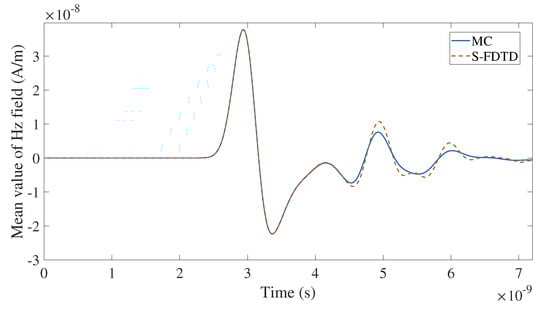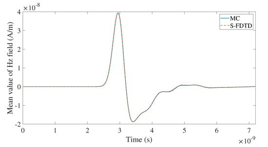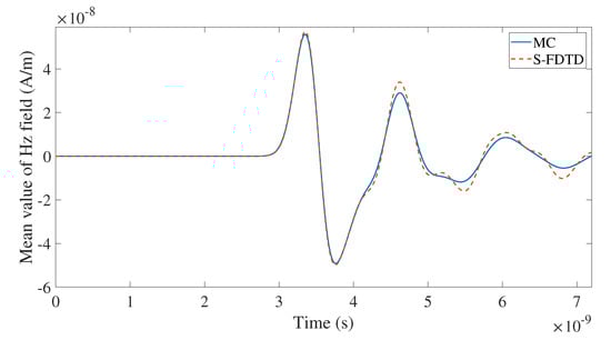 Mean value of field at point (140, 140) for the first numerical test. Monte Carlo (MC), stochastic finite-difference time-domain (S-FDTD).