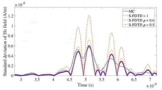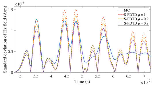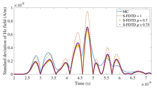 The proposed technique is evaluated via three 2D EM problems with random dielectric slabs. Specifically, the first test case involves a lossless rectangular material with uncertainty in its width and height. In Figure 1, the schematic of the examined problem is presented. The computational domain is discretized into cells with mean spatial steps equal to , where denotes the wavelength in the vacuum at 2 GHz. The random dielectric is located at the 140th cell, while the remaining space is filled with air. The dielectric permittivity of the slab has a value of and the stochastic variables follow a normal distribution with standard deviations equal to the of their corresponding mean values. It is worth mentioning that the time-step is equal to and the total simulation time is 7.2 ns. Finally, unwanted reflections are reduced by employing the first-order Mur absorbing boundary [] condition (ABC). This ABC is simple and requires less computational resources than the perfectly matched layer (PML) []. The proposed S-FDTD technique is compared with 1000 MC realizations. Particularly, Figure 2 and Figure 3 depict the mean and the standard deviation of the magnetic field at point (140, 140). In Figure 3, the accuracy of the proposed technique is examined with various correlation coefficient values. By setting , we guarantee a good agreement from 4 to 5 ns compared to the MC method. For , valid outcomes can be extracted around 0 to 4 ns, while gives satisfactory results, between 5.25 and 7.2 ns.