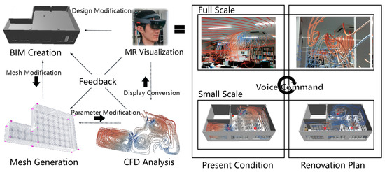 This research developed an integrated system for stock renovation that includes CFD and MR methods to enable simultaneous design of the building and thermal environment. The integrated system mixed the real-world indoor environment (augmented by digitized CFD data in 4D (3D plus time)) and simulated indoor environment (augmented by real world data). The CFD results are visualized on head-mounted display (HMD), which enabled stakeholders to fully understand the design concept. In addition, users are free to change the indoor layout and then simulate and evaluate these proposals using the proposed system, such that they are presented with a variety of design options that they can better understand as they experience and interact with them. The main novelties of the developed system, including, but not limited to, automatic animation generation sequence, anchor cube, vertex shaders, sight tracking component, and voice command function, are introduced in Section 3.